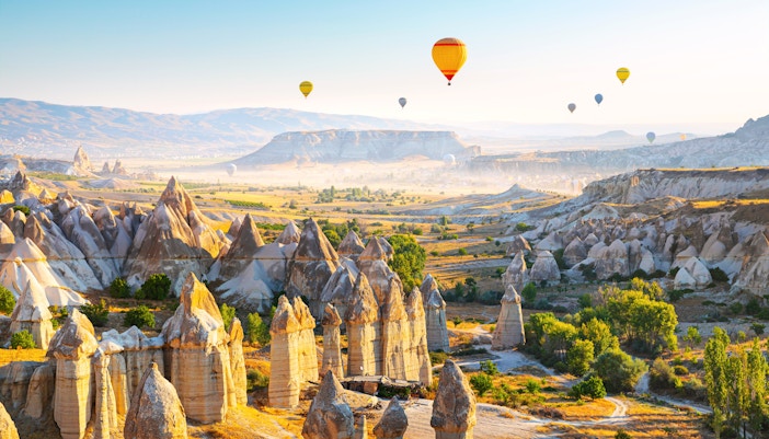 Enjoy a gentle flight above Cappadocia’s fairy chimneys at sunrise on a scenic hot air balloon ride over Goreme Valley.