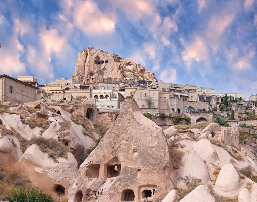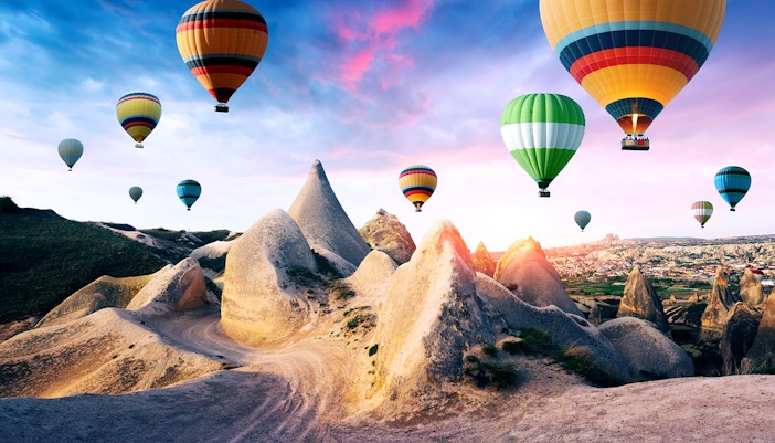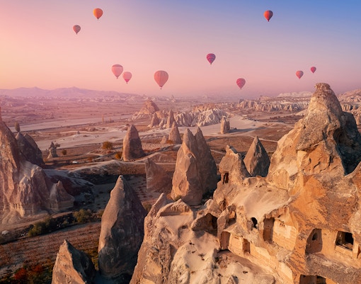 Enjoy a gentle flight above Cappadocia’s fairy chimneys at sunrise on a scenic hot air balloon ride over Goreme Valley.